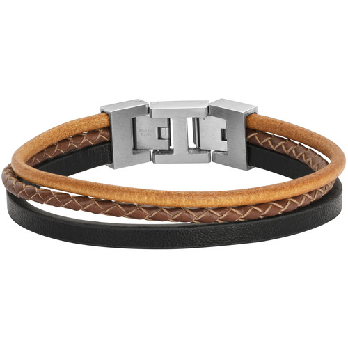 Le trio de cuir stylé, pour un style mémorable. Découvre un bracelet étonnant, composé de cuir et d'acier 316L inoxydable. Ce bijou arbore un très beau brin de cuir tressé couleur crème, qui contraste parfaitement avec une bande large et un lacet en cuir marron. Garanti 2 ans et fermé par un double clip, sa longueur s'ajuste de 19,5 à 21 cm. Le bracelet de cuir, idéal pour accessoiriser naturellement tes tenues. Ajoute juste ce qu'il faut de piquant spontané à tes tenues basiques ! Avec son fermoir en acier inoxydable, ce bracelet souple Phebus pour homme incarne confiance, audace et authenticité. Cuir synthétique.