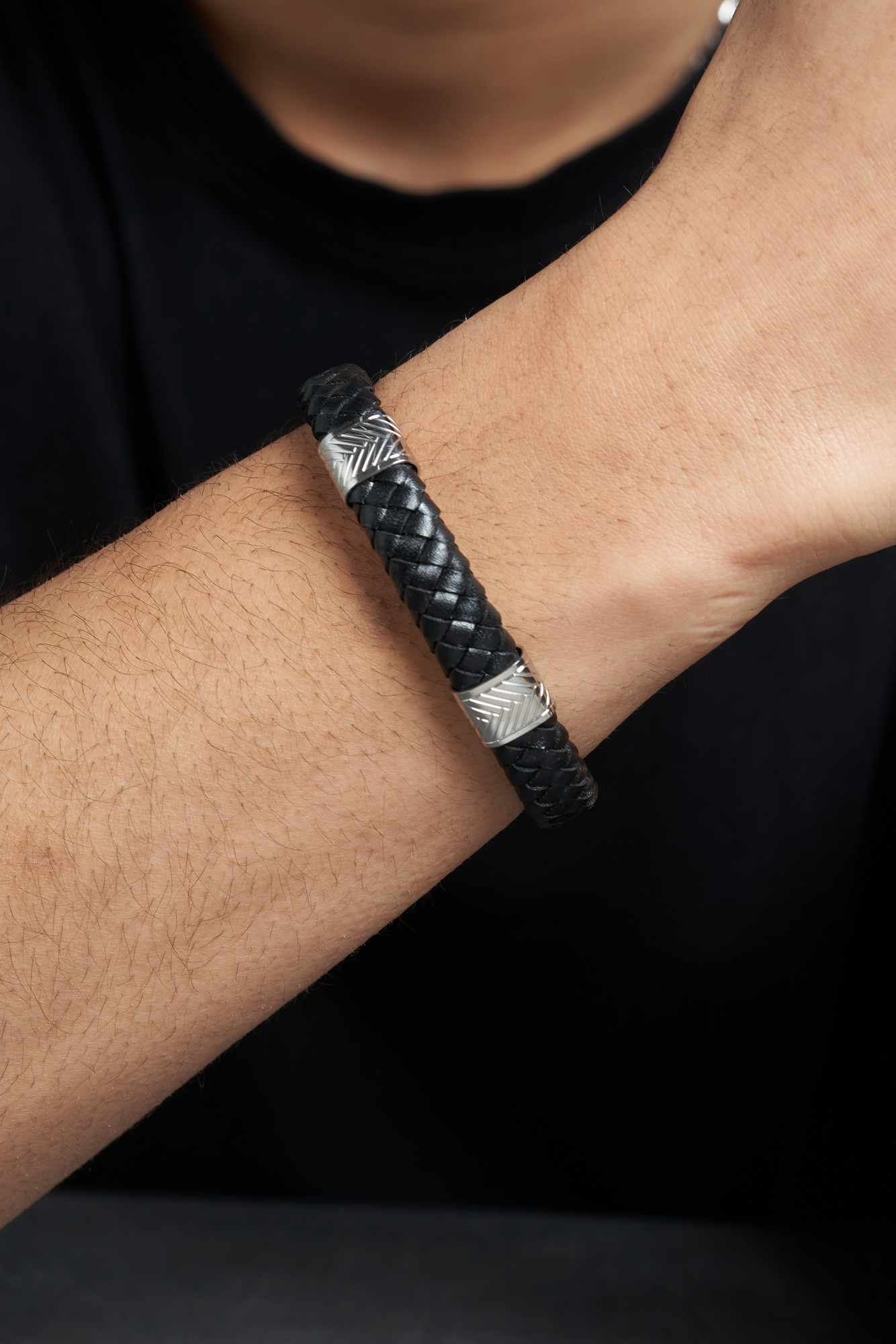 Le bracelet homme Maddox incarne un style à la fois robuste et raffiné. Conçu en cuir noir tressé, il se distingue par ses détails en acier gravé qui ajoutent une touche graphique et contemporaine. Son fermoir sécurisé en acier inoxydable assure praticité et confort au quotidien. Avec son design moderne et affirmé, le bracelet Maddox est l’accessoire idéal pour sublimer un look décontracté comme une tenue plus habillée. Fidèle à l’ADN urbain et masculin de Phebus, il allie élégance et caractère dans un bijou incontournable. Cuir de vache.