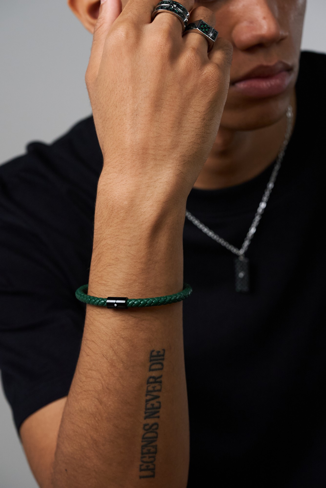 Le bracelet homme Manuel s’affirme ici dans une version originale en cuir vert tressé et acier noir. Son fermoir magnétique, pratique et sécurisé, est sublimé d’un diamant central qui apporte une touche de brillance et d’élégance. Avec son contraste audacieux entre cuir vert et acier noir, relevé par l’éclat raffiné du diamant, ce bracelet incarne parfaitement l’ADN urbain, masculin et élégant de Phebus. Idéal au quotidien comme en soirée, il se porte avec un look décontracté ou habillé pour affirmer son style. Cuir de vache.