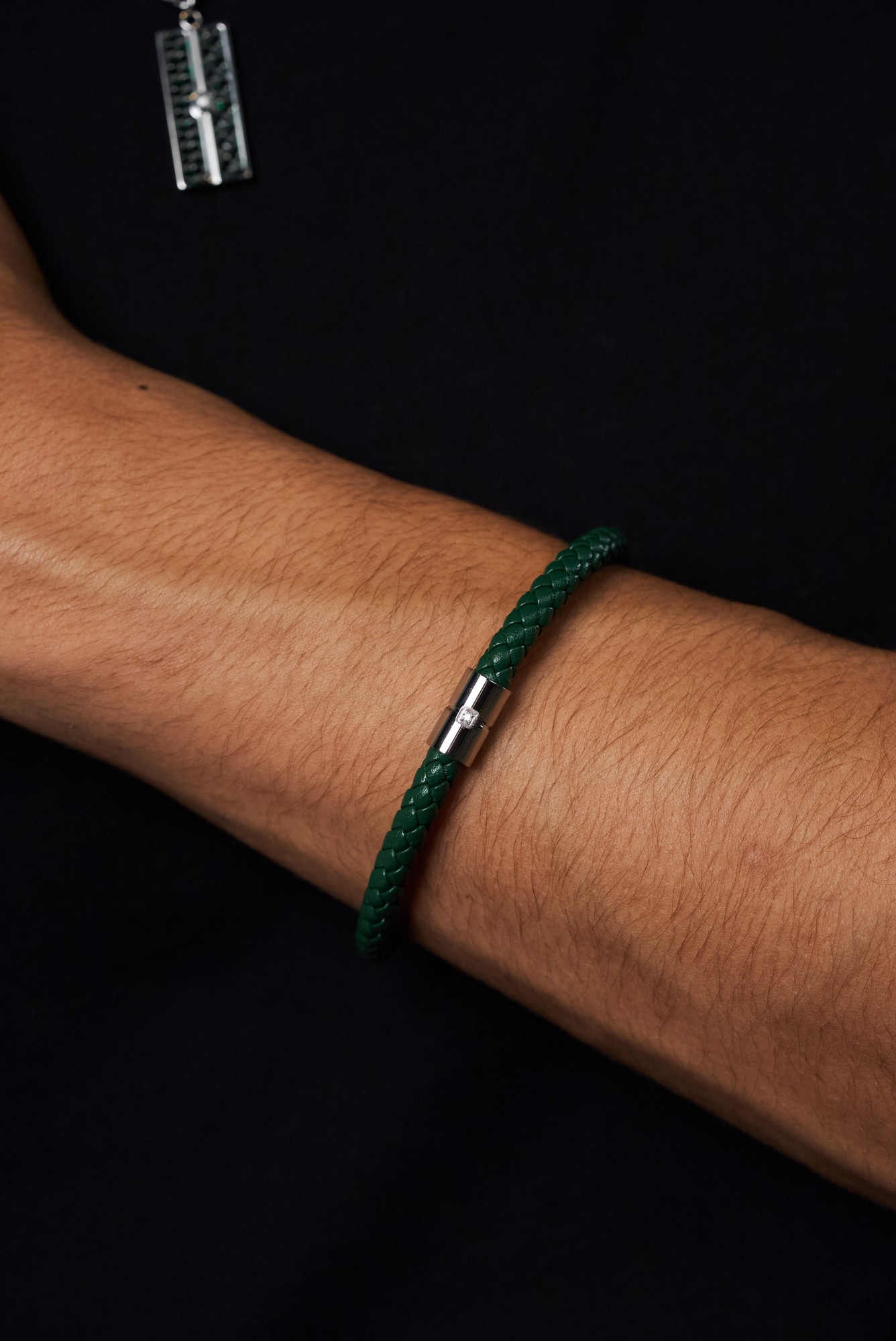 Bracelet homme Philippe cuir vert tressé acier et diamant